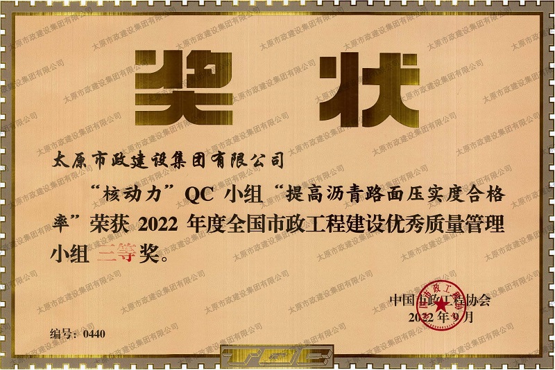 資質證書 營業執(zhí)照 2022年度市政工程最高質量水平評價_H5-1路道路及配套工程(二標段) 2022年度工程建設誠信典型企業 中國施工企業管理協會_AAA級企業信用等級 2022年度全國市政工程建設優(yōu)秀質量管理小組三等獎_''核動力QC小組”提高瀝青路面壓實度合格率”